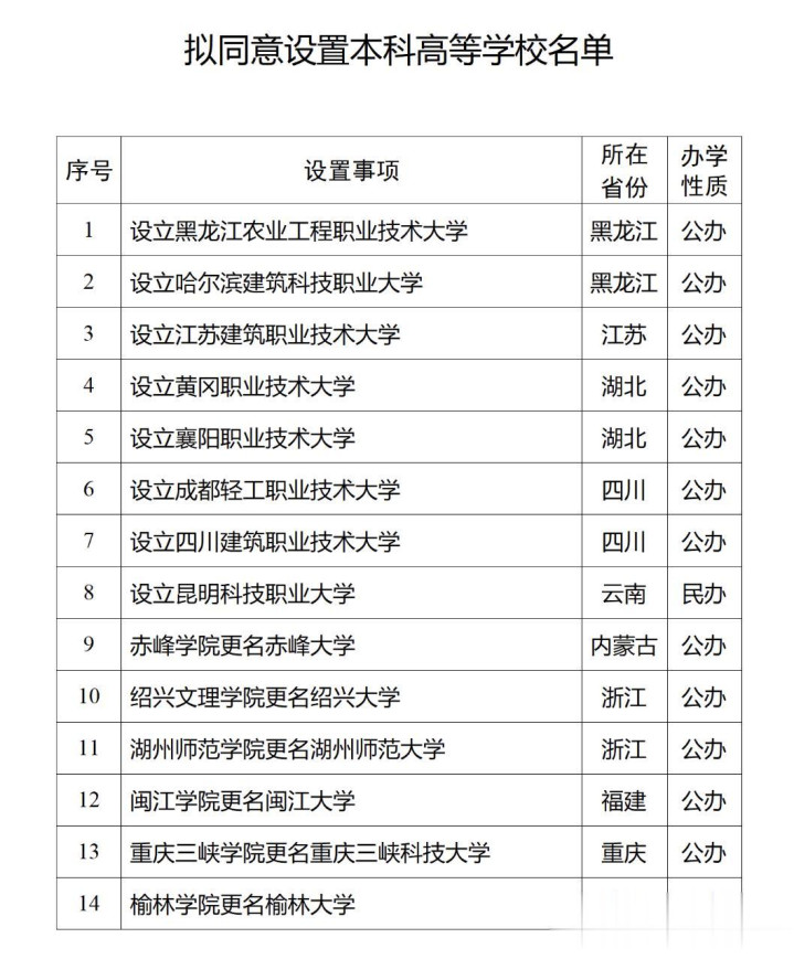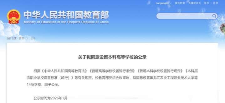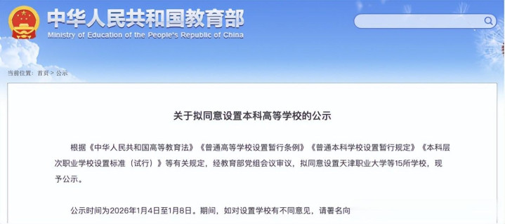 公示节奏超密集,官方信号明确:第一次是1月4日,教育部公示15所拟新增本科高校,公示期至1月8日;第二次是1月12日,再公示14所,公示期至1月16日。两次公示叠加,29所新大学的名单正式浮出水面,涵盖职业本科、高校升级、新设本科等多种类型。